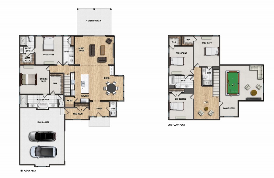 First Floor Primary Bedroom and Guest Suite. Open concept kitchen with dining room and family room. Large laundry room on first floor. Oversized two car garage. Loft and Massive Bonus Room upstairs. 4237 SF with Covered Porch off the back.